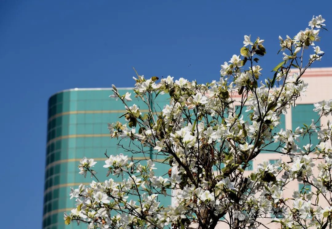 宫粉紫荆花在枝头周围绽放,如云似霞。