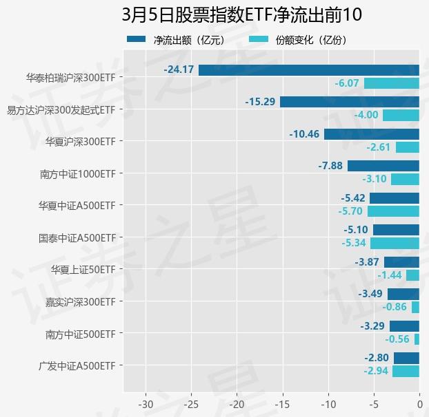 当天有 258 只股票指数 ETF 资金出现净流出,其中华泰柏瑞沪深深排名第一。 300ETF(510300)减少了份额 6.07 一亿份,净流出额为 24.17 亿元。