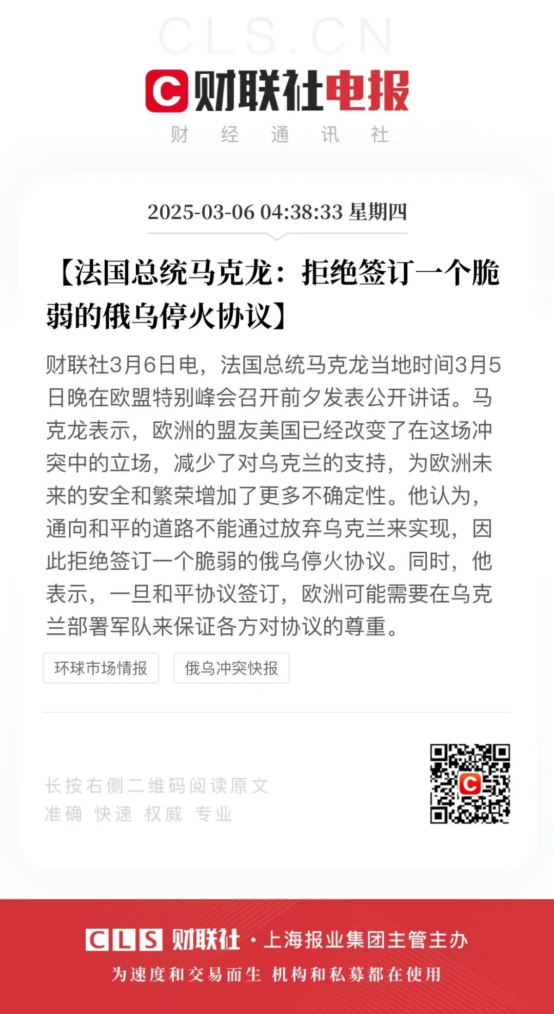原题:马克龙:拒绝签署一份软弱的俄乌停火协议