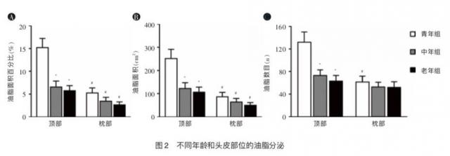 研究表明(上海市皮肤科医院研究室,征集 62 各年龄段的女性测试者),无论是油脂面积百分比、油脂面积还是油脂数量,青年组都远远高于中老年组。