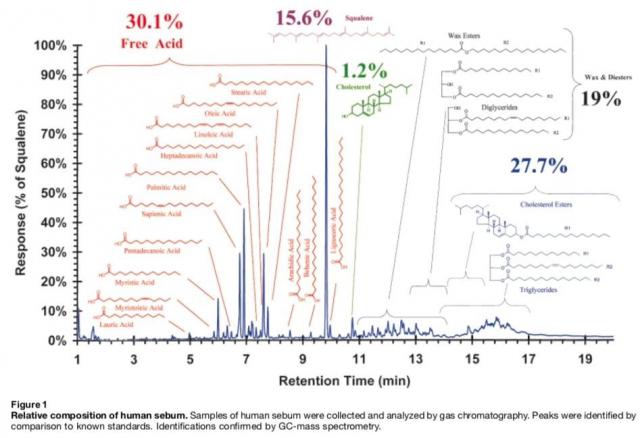 在这种独特的生态模式下,这些分泌的油脂会被头皮上的土壤(马拉色菌等微生物)溶解。(通过 GCMS 油脂是一种复杂的混合物,主要由游离脂肪酸、蜡酯、胆固醇酯、角鲨烯等组成。