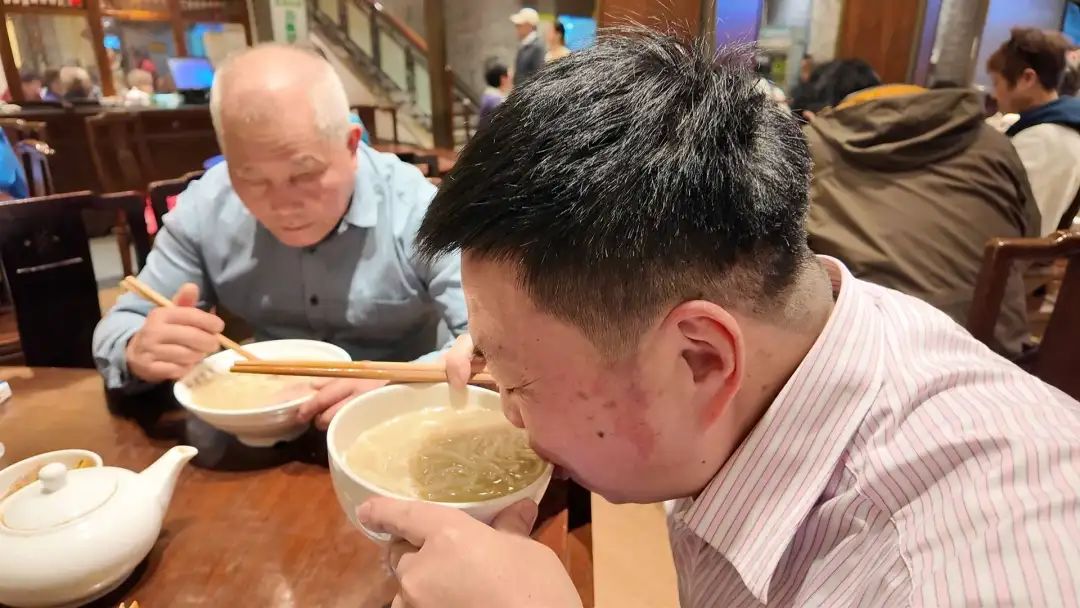 午市鼎沸的时候,每张八仙桌旁都会有三四个食客等着。西装革履的白领坐在布衫布鞋的老克勒旁边,面条一个接一个。一个叔叔面前摆着蒸刀鱼,筷子尖上轻轻挑着白鱼:“小时候买不起,现在一百二十一都想满足自己的渴望!”邻桌的年轻人学会了抿刺,却被骨头刺伤了,让他们笑了。
