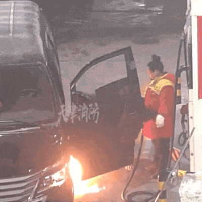 2021年1月9日,在湖南省邵阳市的一个加油站,一辆车在加油时,车主触摸油盖产生静电,然后起火。加油站工作人员冷静应对,迅速拿出灭火器灭火。原来车主穿着睡衣,冬天气候干燥,手上堆积静电瞬间放电,点燃油箱周围堆积的油气,形成火焰。
