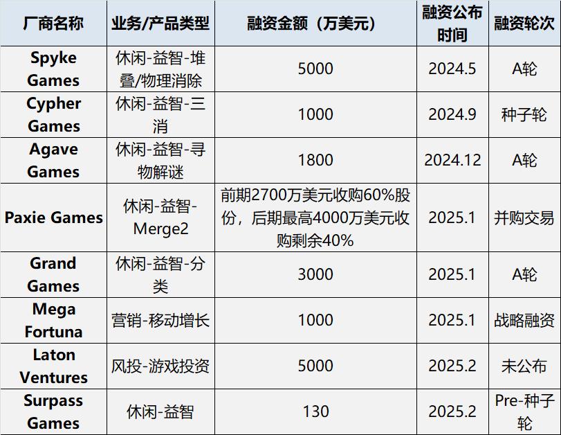 此前 Newzoo 数据显示,2024 全球手游产业年度总收入达到 926 亿美元,同比增长 3%;而来自 AppMagic 数据显示,2024 年度欧美等头部市场(即T1) )休闲手游的总收入将达到市场 152 亿美元,同比增长 11.7%,增幅明显高于市场。休闲轨道的逆势增长吸引了资本的注意力;即使不看已经占据头部位置的传统三消合成,土耳其厂商也在过去一年里跑出了很多新产品,比如物理/堆垛清理、分类、寻物解迷,所以受到投资者的青睐。