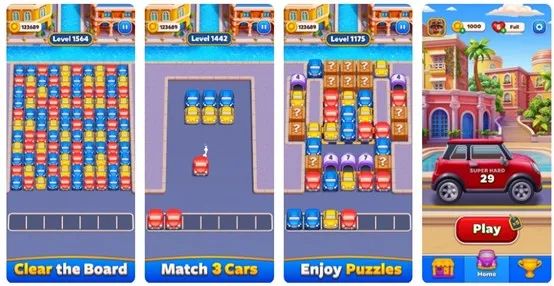 类似的还有 Grand Games,企业在 2024 年 7 月上线的「Car Match」在机制上和 Voodoo 的「Block Jam 3D」基本一致,但是另一个非常流行的主题“停车场华容道移车”应用于主题和材料设计。,所以玩家的目标就变成了在有限的时间内 3 各种颜色相同的车辆一辆一辆地“移出”停车场消除,做出了一定的创意。但是商品上线以来一直没有什么水花,DAU 最高只有 1200 人类左右。要想在爆款游戏中做出心思,也许还需要进一步的打磨。