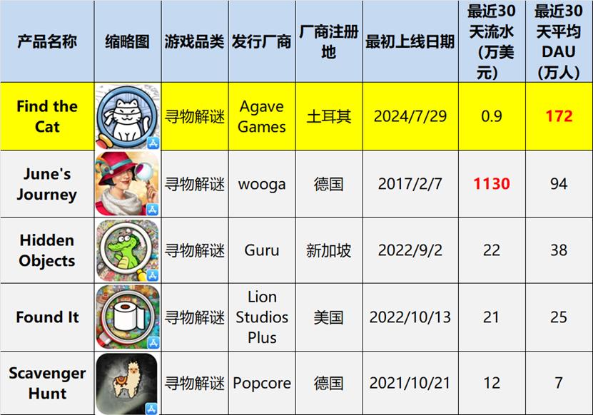 以及 2024 年 12 月完成 1800 万美金 A 轮融资的 Agave Games,公司的产品「Find the Cat」专注于寻找物解迷子类,这种类型过去主要是德国制造商的舞台。这款游戏以“猫”为主角,「Find the Cat」的 DAU 迅速上升,变成 DAU 寻物解谜游戏最高。