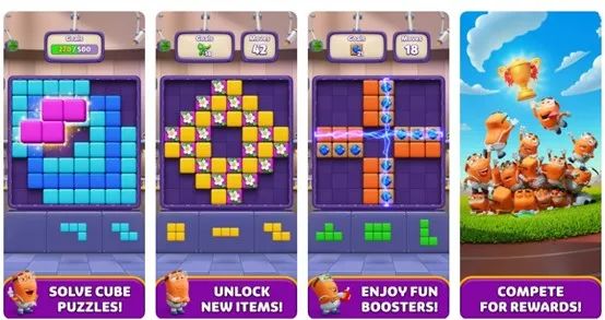 就玩法而言,「Cube Busters」和「Block Blast」基本上是一样的,但最大的区别是“障碍”更加多样化,出现了“花瓣”、不同颜色的方块,如“晶石”,为游戏增添了深度。还有一点值得注意。原创性出现在游戏中 IP“方块小人”,做原创 IP 之前已有厂家尝试过吸量,比如德国厂商。 Olleyo 的「Piggy Kingdom」依靠主角“猪王”的亲和力,打开了属于自己的市场区间。Spyke Games 这种尝试能否与“方块”玩法一起产生新的可能性,甚至做出大流水,作者也会继续关注。