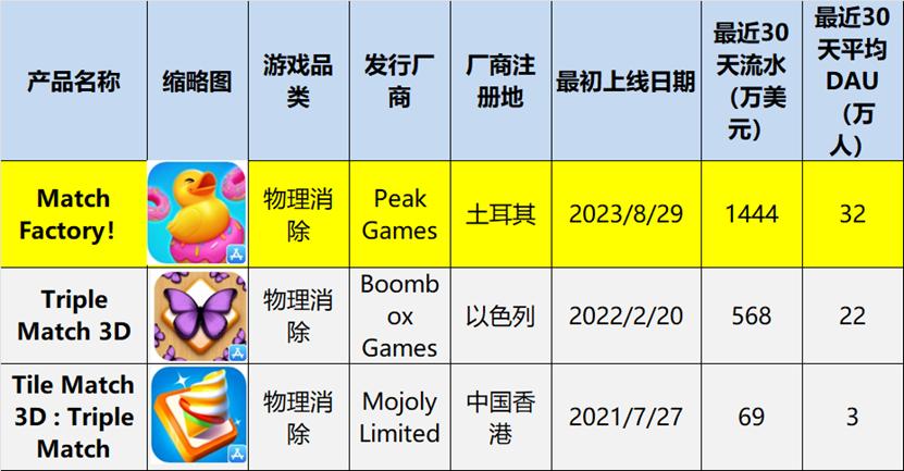 土耳其厂商 Peak Games旗下的「Match Factory!」是现在的月流水和DAU 最高物理消除游戏 | 信息源:点点数据,data.ai