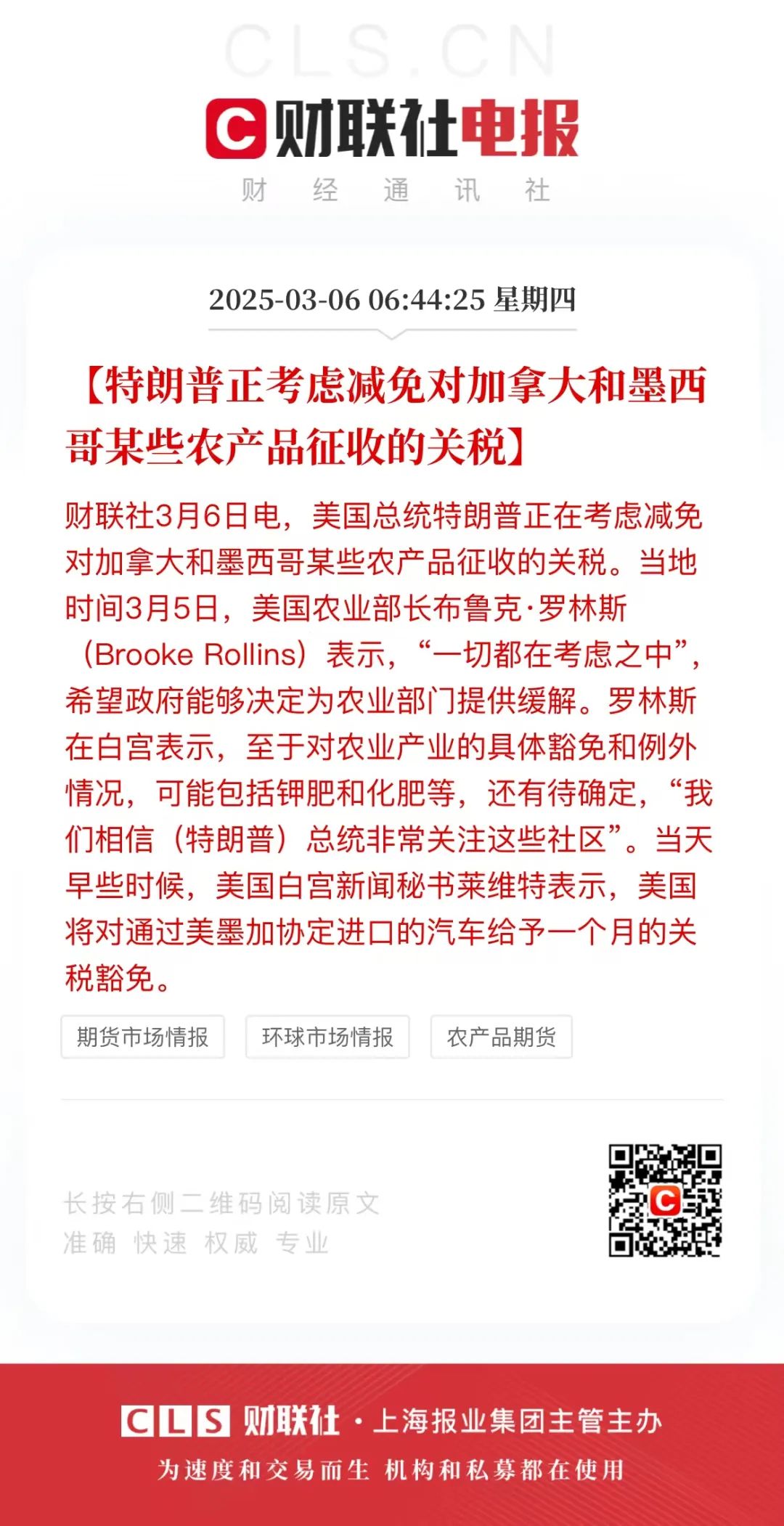 美国总统特朗普正在考虑减少对加拿大和墨西哥部分农产品征收的关税。美国农业部长布鲁克·罗林斯,当地时间3月5日。(Brooke Rollins)表示,“一切都在考虑之中”,希望政府能决定减少对农业部门的缓解。罗林斯在白宫表示,可能需要确定农业产业的实际豁免和例外,包括钾肥和化肥。“我们相信(特朗普)总统非常关注这些社区”。当天早些时候,美国白宫新闻秘书莱维特表示,美国将对通过美墨加协议进口的汽车提供一个月的关税豁免。