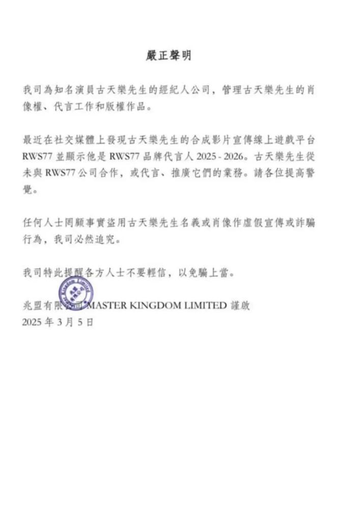 演员古天乐、林邈发表严正声明:被AI生成游戏代言宣传片,不要轻信!