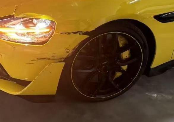 图中,一个闪电黄色配色的小米 SU7 Ultra 受到摩擦,左前翼子板开裂,大灯灯罩也出现裂缝,事故原因尚不清楚。