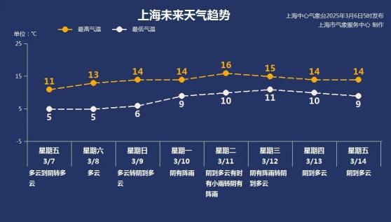 明天和周末,上海以阴天或阴天为主,阳光出勤率增加,气温逐日上升,最低气温在5~6℃,最高气温在11~14℃之间。下周初,暖湿气流再次活跃,新一轮阴雨天气再次回升。保持温度上升趋势,释放春天即将到来的信号。