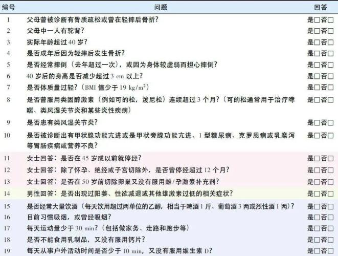 以上问题,只要你回答“是”一个以上的问题,就会提醒你骨质疏松的风险,建议去医院做骨密度检查或者骨折的风险评估。