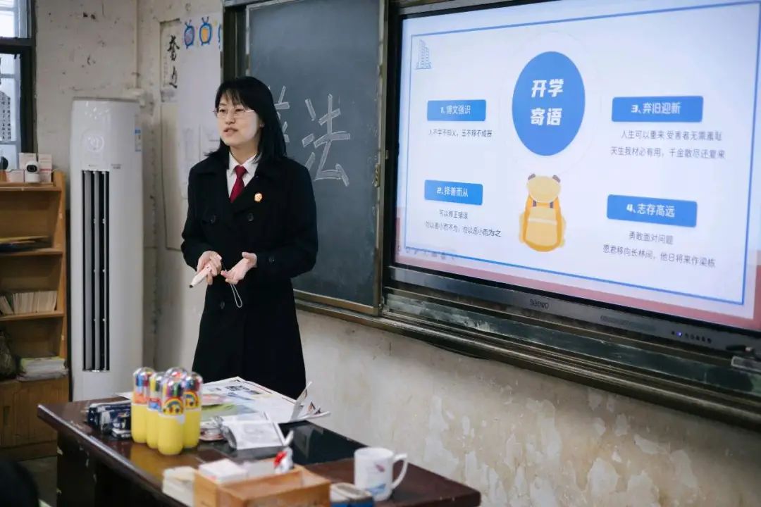 县法院刑事法院副院长、盐埠中学法治副校长宋文靖以反对校园欺凌的方式向学生赠送了“博闻强知、择善而从、弃旧迎新、志向远大”的法官信息。