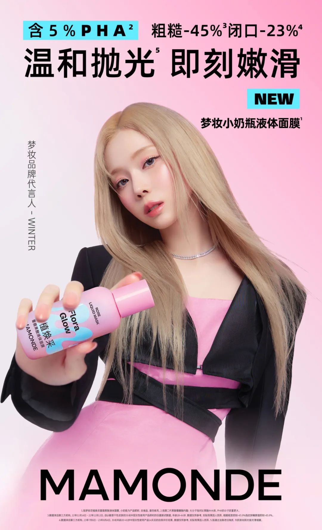 另一方面,爱茉莉太平洋品牌梦妆携手品牌代言人——韩国女团Aespa成员WINTER,推出花卉植物玫瑰果酸液体面膜。