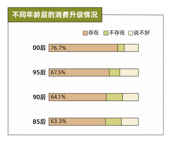 当然,这里消费升级最常见的还是集中在00后,接近80%,果然越年轻越愿意花钱。