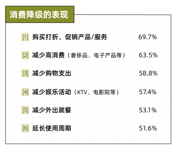 但是当被问及他们将从哪些方面减少开支,或是哪些行为属于消费降级行为时。