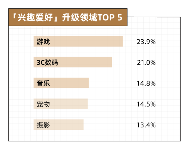 在每一个兴趣圈里,谁能打得最好?游戏,3C数字,音乐排名靠前,游戏氪金,“吃谷文化”、宠物和oc(原创设计)等费用,就像甜品存另一个胃一样,兴趣消费也有另外一个钱包。