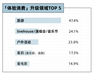 在消费升级中,47.4%的人将“旅游”列为TOP 1、在Livehouse、音乐会和户外活动中花费约24%。