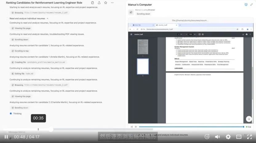 Manus可以帮助用户在视频显示的一个案例中筛选简历。当客户向Manus发送包含10份简历的Zip包装文件时,Manus会像人类一样工作,首先解压文件。但是浏览每份简历并记录关键信息,最后整理出排名建议、候选人简介、评估标准等附加材料。