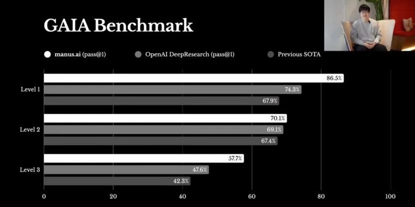 据悉,在GAIA基准测试(一般AI助手评估,一种全新的标准测试工具,专为评估AI助手处理现实世界问题的能力而设计)中,Manus 最先进的SOTA表现在所有(共3个)难度水平上,性能超过了OpenAI的同级大型模型。