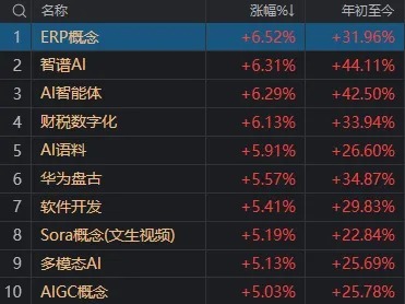 在领先板块中,第一梯队基本上来自AI应用方向,如ERP概念、财税数字化、AI智能体等,增长超过5%。