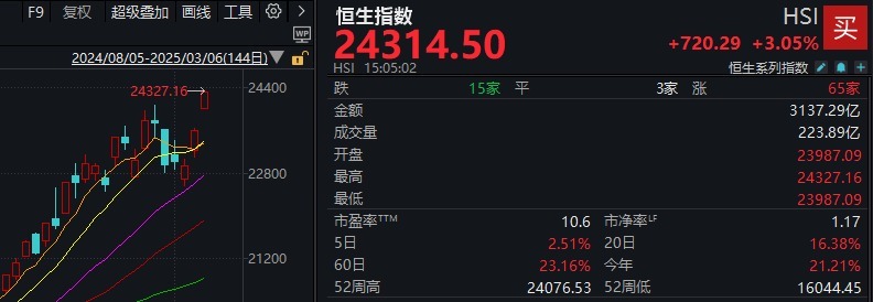 截至a股收盘时段,恒生指数持续高开高走,上午强势收复24000点,创下2022年2月至今的三年新高。恒生科技指数涨幅达到5%。在指数权重股中,腾讯控股股价除了阿里巴巴大幅上涨外,也创下了近三年的新高。