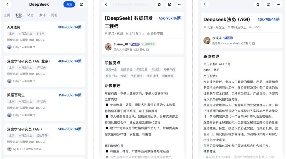 “脉脉高聘”显示,DeepSeek多位高管也在脉脉高聘平台上“求简历”,涉及R&D、财务、法律事务、见习生等多个岗位,其中AGI深度学习研究人员年薪最高超过120万元。