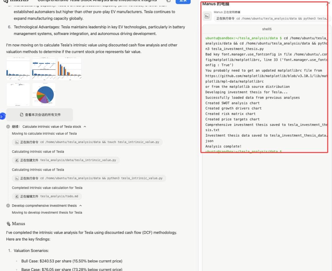 还有一点就是Manus在对话生成演示视频时,AI操作文档的方式和真人一样。例如,在计算特斯拉的财务报告时,我们可以看到AI确实在打开和浏览网站,并编写代码,然后进度条不断前景。
