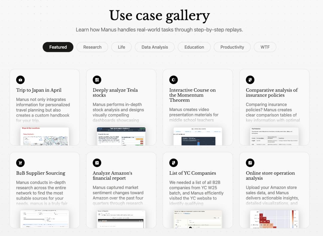 把它AI 与CHATGPT和其他大型模型相比,agent的工作场景是建立起来的,只是在官网列出文档或者不告诉用户能做什么。这是客户体验极好的一点,可以直观的感受到Manus能做什么,有什么新的能力和现在的AI产品不一样。