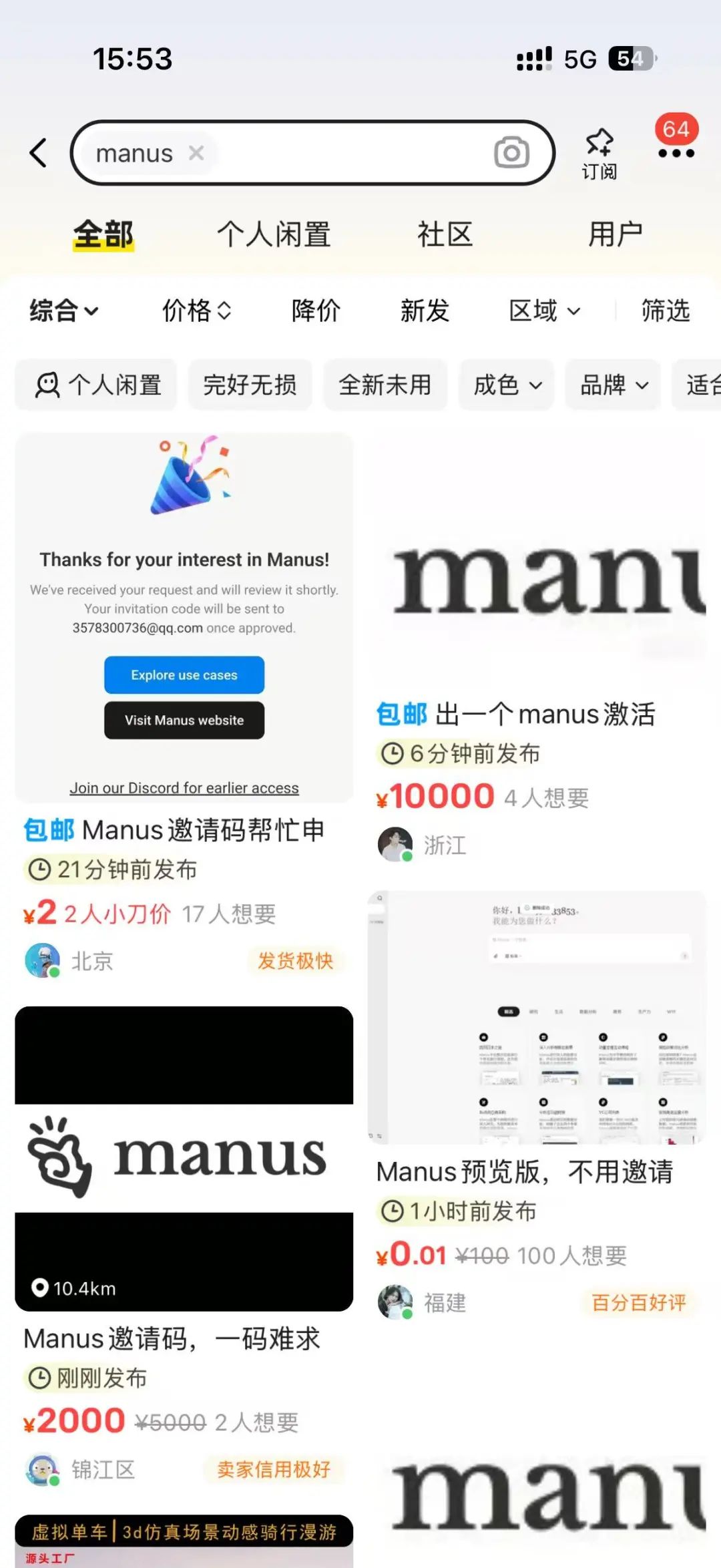 现在Manus的价值,推荐码在闲鱼中有一个价值:一万: