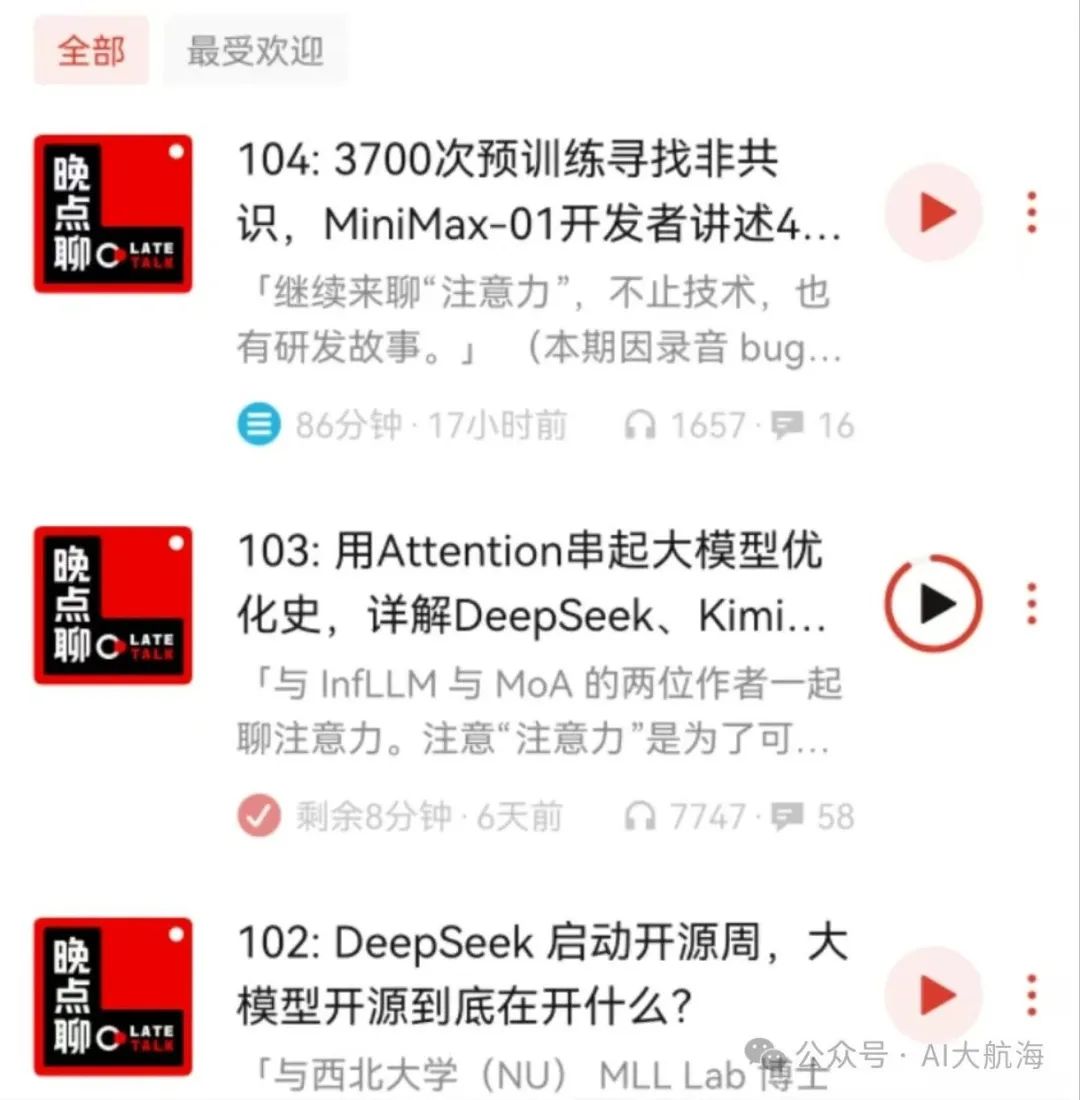 媒体上也有更多关于技术创新的报道。在小宇宙中,晚点和张小珺连续几集带观众阅读论文,第一期解读推理模型。 R1 和 k1.5.第一阶段解读注意力机制的改进,是为了做李沐先生的工作。要知道,读论文是一项非常少数的专业活动,现在已经成为一种流行的科普——“让我试着用人类的话来告诉你他们创新了什么”。