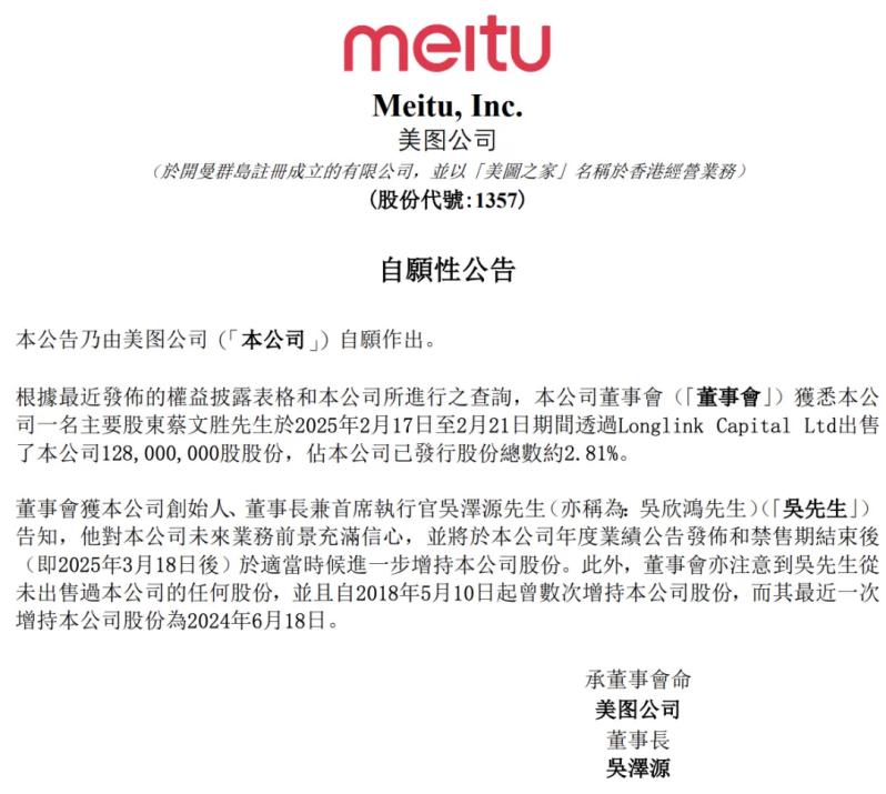 2月25日,港股美图公司(01357).HK)公司主要股东、创始人、前董事长蔡文胜于2025年2月17日至2月21日通过Longlink Capital Ltd出售了该公司1.28亿股,约占该公司已发行股份的2.81%,此次减持后,蔡文胜的持股比例从23.02%下降到20.62%。