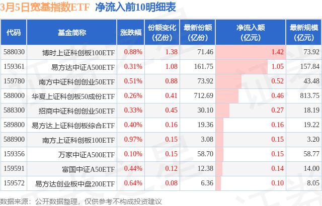 当天有 24 只宽基指数 ETF 资金净流入显示,其中博时上证科技创新板净流入排名第一。 100ETF(588030)增加了份额 1.38 十亿份,净流入额为 1.42 亿元。