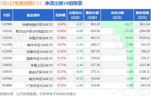 当天有 105 只宽基指数 ETF 资金出现净流出,其中华泰柏瑞沪深深排名第一。 300ETF(510300)减少了份额 6.07 一亿份,净流出额为 24.17 亿元。