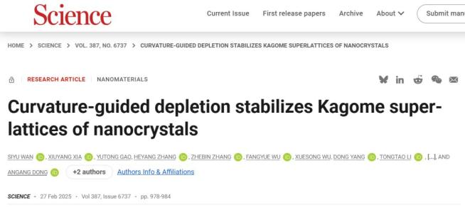 针对上述问题,2025年2月27日,复旦大学化学系董安钢、李同涛团队联合高分子科学系李剑锋团队和新加坡南洋理工大学倪冉团队另辟蹊径,报道了基于曲率介绍的纳米粒子超级晶格的研究,提出使用非凸起(nonconvex)通过调节颗粒局部曲率,纳米颗粒构建基元,创造颗粒间定向相互作用,具有类原子价键特征。非凸形哑铃形纳米晶体表现出全球连锁自组装行为,由曲率引导耗尽相互作用控制。非凸形哑铃形纳米晶体表现出全球连锁自组装行为,由曲率引导耗尽相互作用控制。通过调节纳米哑铃的局部曲率,可以准确灵活地调节颗粒形成键的方向,这是普通凸面砌块难以控制的。这类纳米哑铃可以长时间有序地组装成各种复杂的二维超晶格,包括手性Kagome超晶格。根据理论计算结果,Kagome晶格是一种热学稳定的晶相,在稳定这些非紧密排列结构中,耗尽相互作用起着至关重要的作用。Kagome晶格和其他不寻常的结构表明,非凸纳米晶体在构建复杂结构方面具有巨大的潜力。在催化、能源、功能设备等领域有望带来创新应用。以“相关结果”为结果Curvature-guided depletion stabilizes Kagome superlattices of nanocrystals"问题发表在Science上。新加坡南洋理工大学博士后、复旦大学化学系博士后、新加坡南洋理工大学博士后、复旦大学化学系董安钢教授、李同涛青年研究员、高分子科学系李剑锋教授、新加坡南洋理工大学倪冉教授是论文的共同通讯作者。