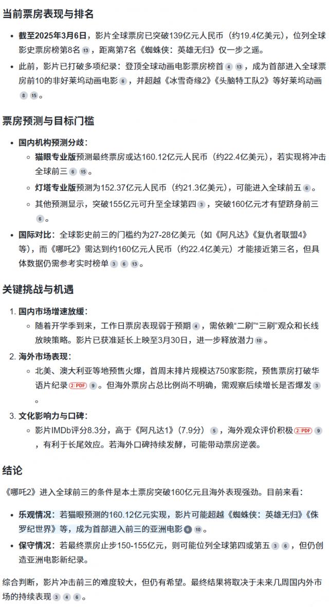 然而,我在其他网络推理模型上尝试了类似的问题。发现票房容易出错,有些模型直接少算。 7 亿,把最后爬上来的东西《 哪吒 2 》回归全球票房第八。