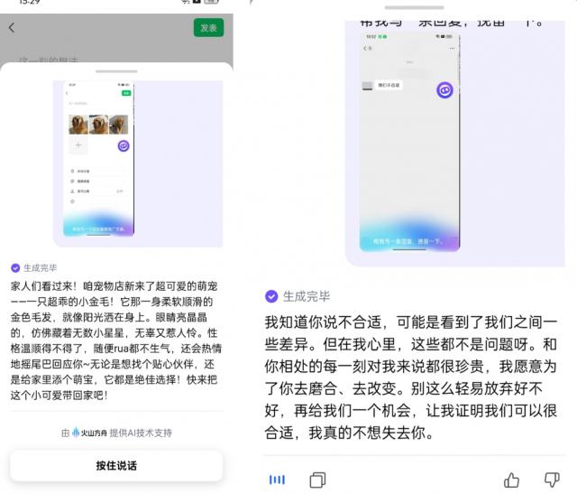 它的功能并不复杂。底层是画面识别,再结合豆包大模型的文案能力。整体交互逻辑很简单。我们可以通过对话和下达指令来捕捉当前手机的场景,然后点击浮球。