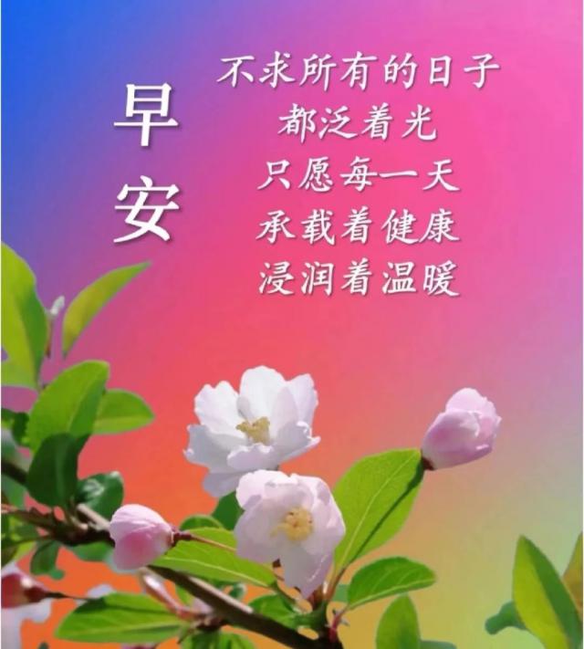 简短的问候,温暖如蜜;一条信息,深情意义重大。在彩云之港,幸福隐藏着你的心;友谊之线,岁月的终点。早上好,亲戚朋友,祝我们都幸福,岁月如初!