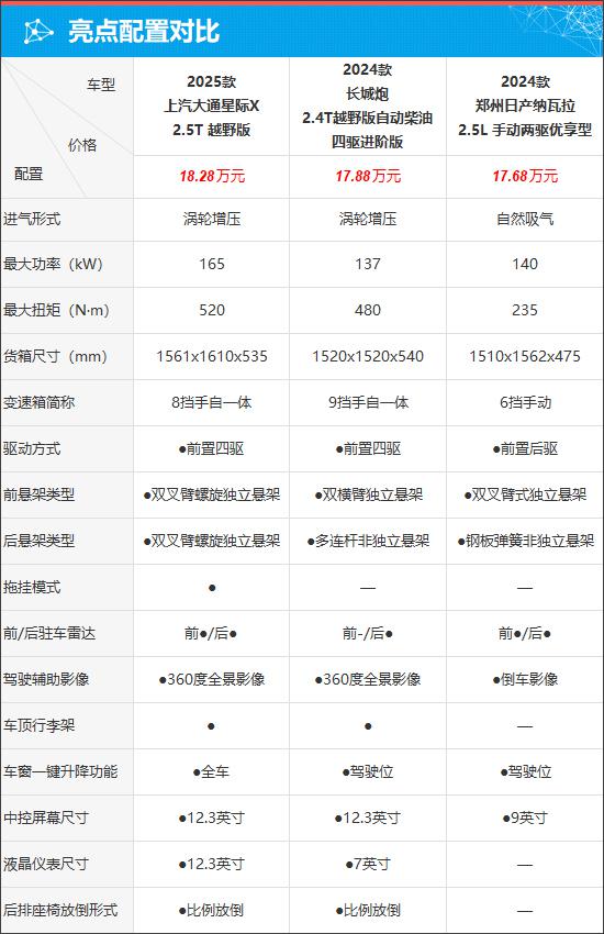 就车辆配置而言,通过对比,上汽大通星际 X 动力参数和车箱尺寸均表现良好。此外,它还独享拖挂方式,整车车窗一键升降, 12.3 英尺液晶仪表。长城炮的配置也很引人注目,包括 360 全景图像、车顶行李架、后排座椅比例放下,都比较实用。郑州日产纳瓦拉各方面的表现都很普通,不仅配备了明显不如其他两款车型的水平,而且是本次对比中唯一匹配的手动变速器车型。目前皮卡车型逐渐偏向乘用车,竞争力确实不足。