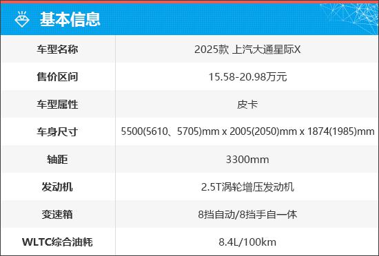 2025 上汽大通星际车型 X 共推出 4 配备车型,售价区间为 15.58-20.98 一万元。值得注意的是,因为星际 X EV 是基于星际 GST 纯电动四驱皮卡由平台打造,所以官网并没有将其与燃油版星际相结合 X 归在一起。