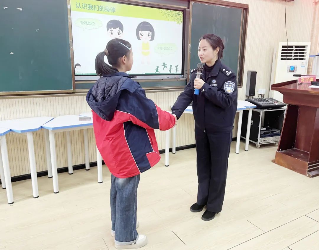 在此期间,于杰华设置了场景模拟、趣味问答、“我告诉你的意思”游戏等环节,用生动的语言、丰富的表情和肢体语言与学生互动,让学生在轻松愉快的氛围中正确认识和了解自己的身体,知道如何远离伤害,引导学生学会正确保护自己,对任何不舒服的触摸说“不”。