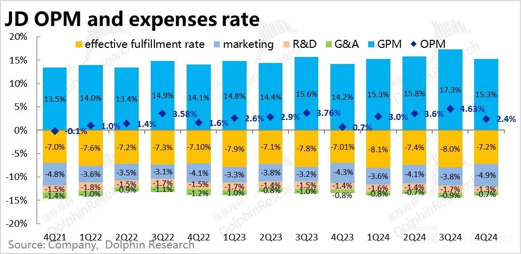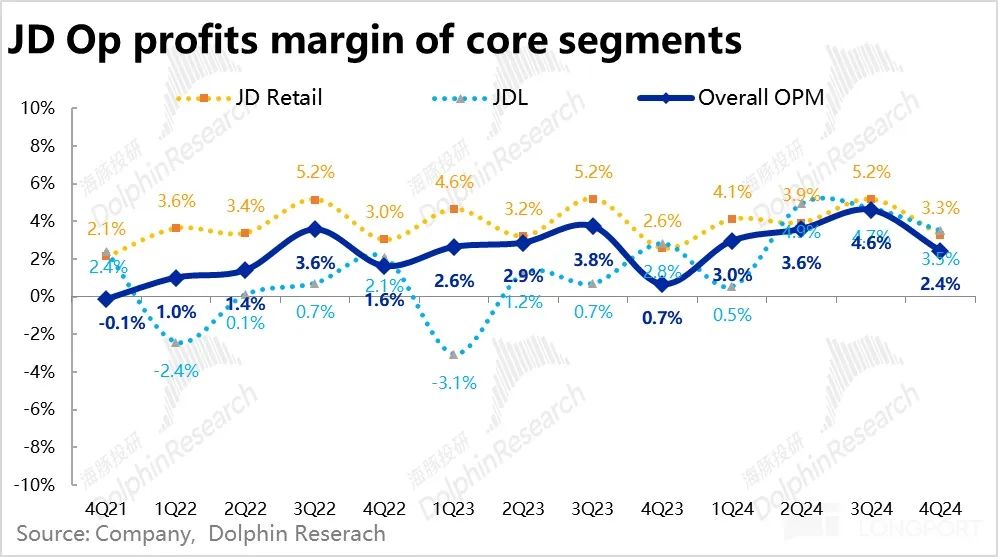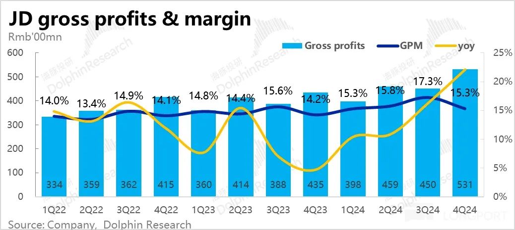 具体而言,主要是通电类产品的收益从上季度开始。 跳跃性上升到2.7% 15.8%,国家补充的带动十分明显。根据 NBS 公布的整体零售数据,家电销售同比增长 10、12 两个月一度接近 40%,市场仍略低估了国补对京东的利好程度。