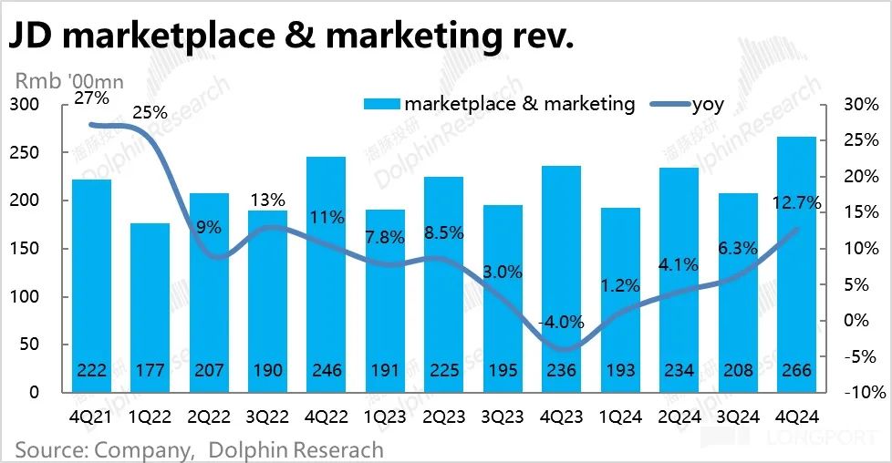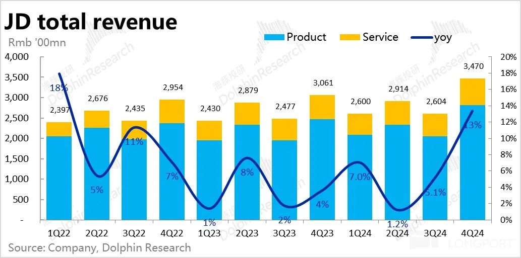 3、总结以上所有业务,本季度京东实现整体营收同比增长。 13%,环比加速近 8pct,也是如此22 2000年后第一次回来 10% 以上,比已上调至 9%~10% 左右卖家一致预期更好。