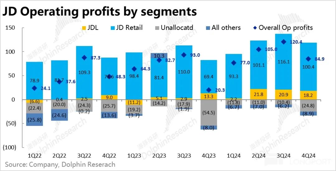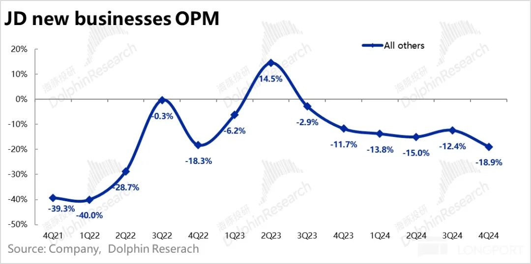 3) 对包括达达的人来说其它业务领域,本季仍然亏损 8.9 亿,在收入逐月萎缩的同时,亏损也在扩大。可以看出,去年第四季度,JD.COM在新业务上的投资有所扩大。