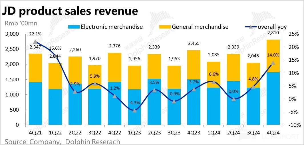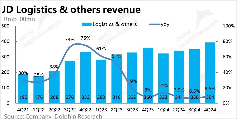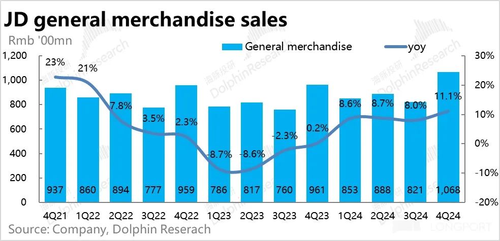 一般商品零售业的增长也是从上一季开始的。 8% 小幅提高到 11%。虽然不直接接受国家补贴的好处,加速也没有通电那么明显,但还是反映了通电商品的补贴&引流,对JD.COM整个平台的销售有溢出的好处。