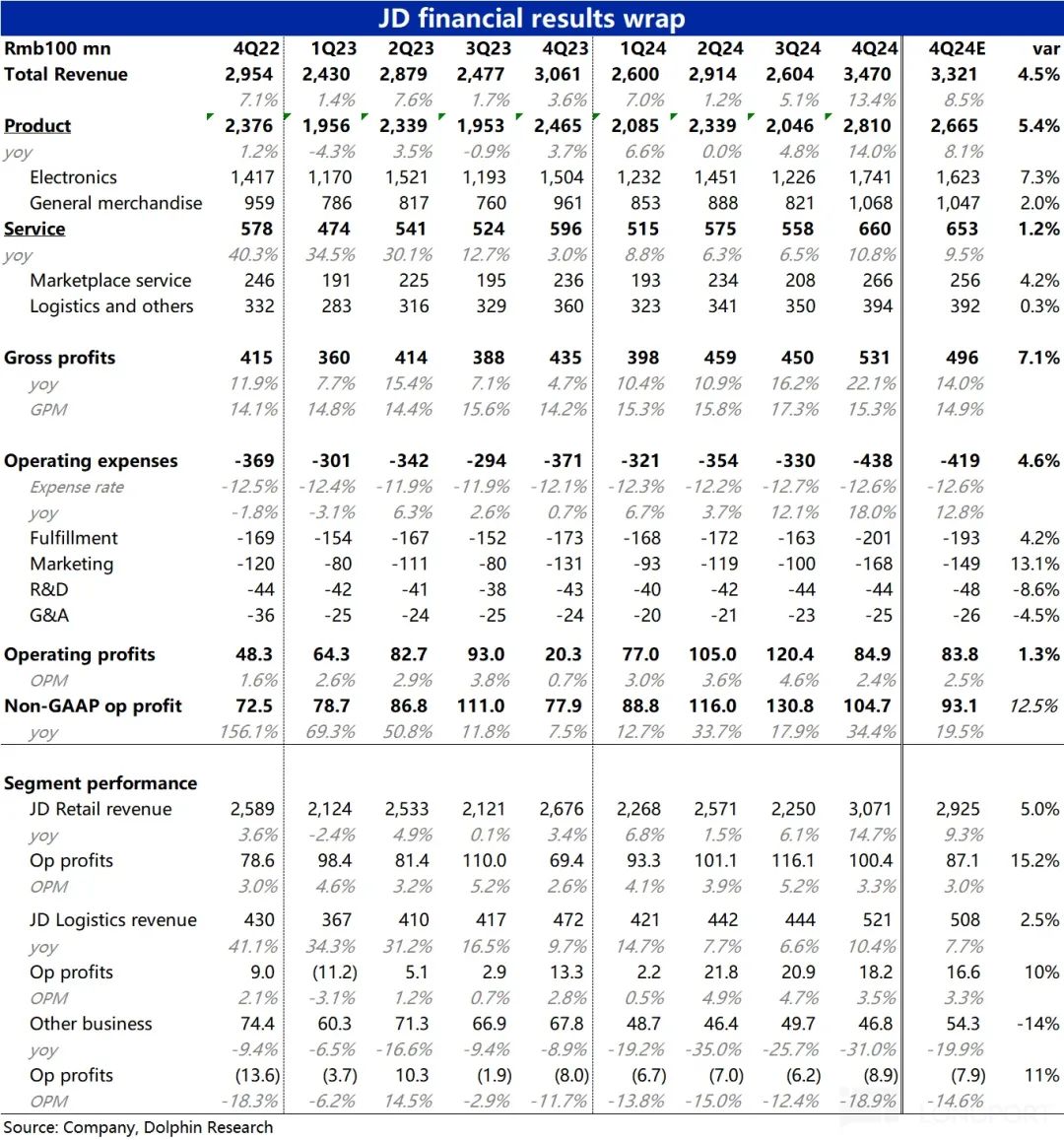 北京时间 3 月 6 日晚美股前,京东公布。 2024 年 4 季度财务报告,总的来说,虽然公司在春节前已经引导市场提高了预期,但实际表现仍然逾期。在国补的利好下,增长和利润表现良好,具体要点如下: