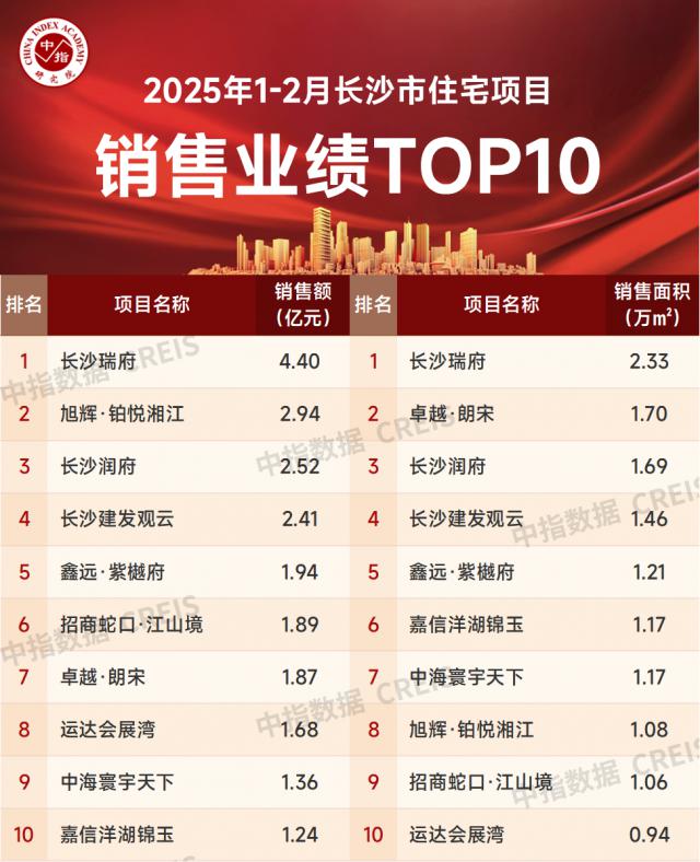 销售额方面,2025 年 1-2 月份长沙商品房销售额排名榜单 TOP10 该项目的总销售额为 22.25 亿元,销售额 TOP10 门槛值为 1.24 亿元。长沙瑞府以雨花区 4.40 1亿元占销售额第一;岳麓区旭辉 · 铂悦湘江以 2.94 天心区长沙润府以亿元排名第二, 2.52 亿元排在第三位。