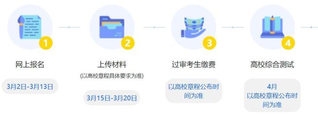网上报名后,部分高校还需要考生在3月15日至3月20日上传材料,具体要求以高校三位一体招生规定为准。通过初试的考生必须在高校章程公布的时间内完成交费。申请流程图如下: