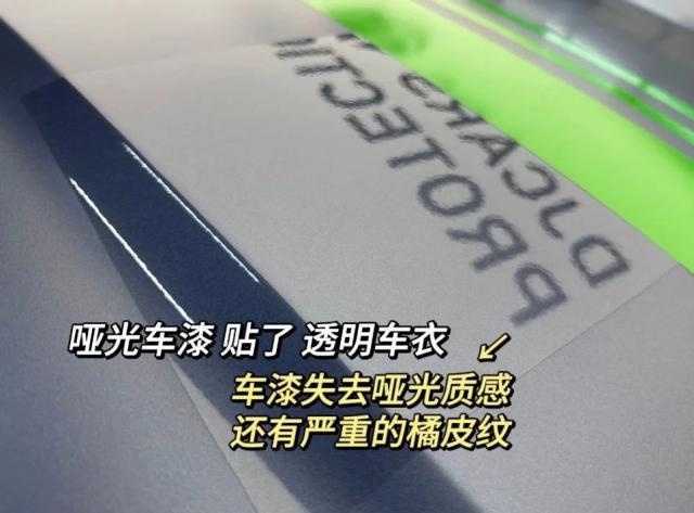 ②【哑光车漆贴透明车衣会有很大的橘皮纹】:哑光漆表面不像亮漆那样光滑光滑,透明车衣贴上后会看到很多凹凸不平的橘皮纹,非常不好看。